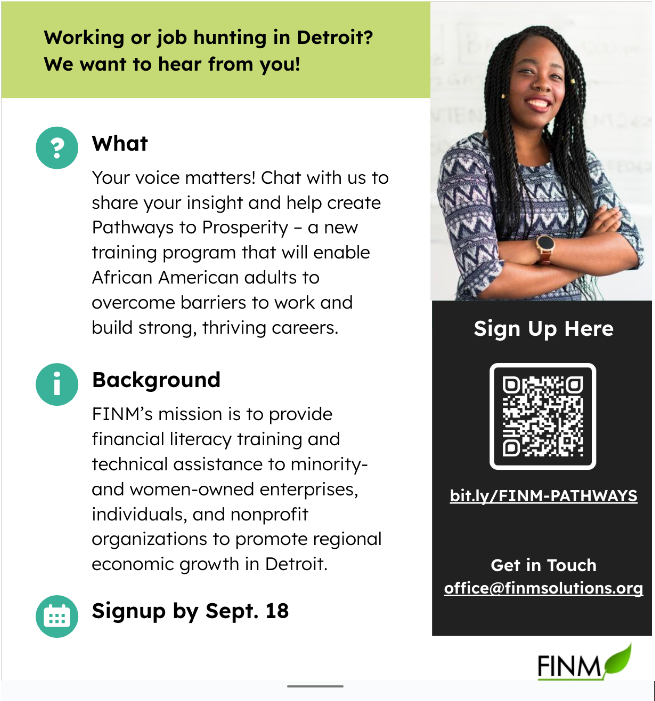 FINM Solutions is a Detroit-based non-profit organization committed to fostering economic growth for Black, Indigenous, and People of Color (BIPOC) individuals and businesses.